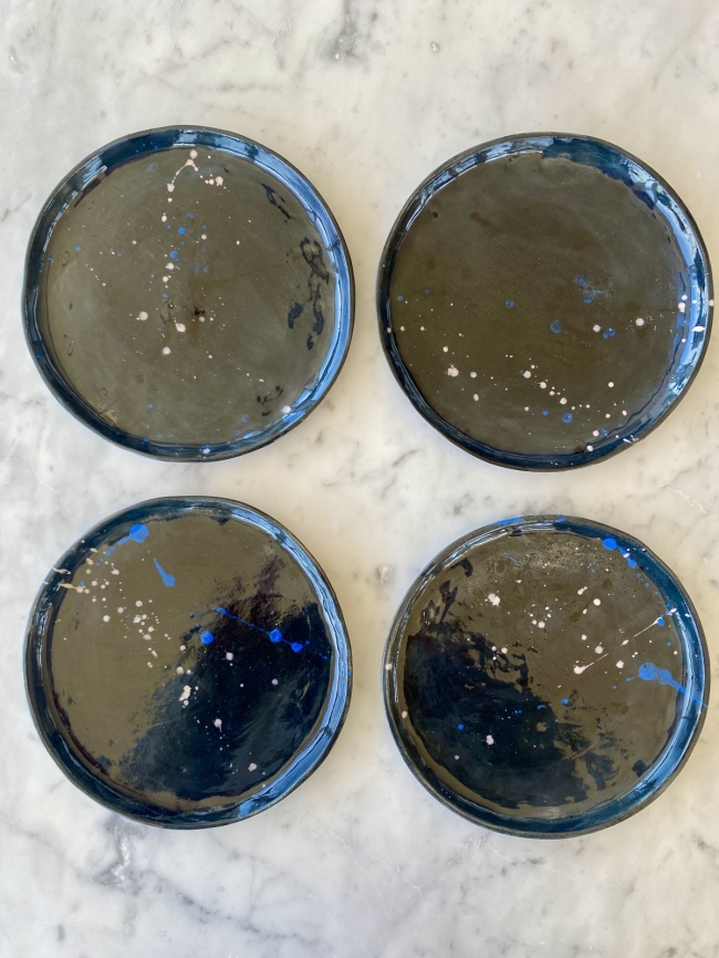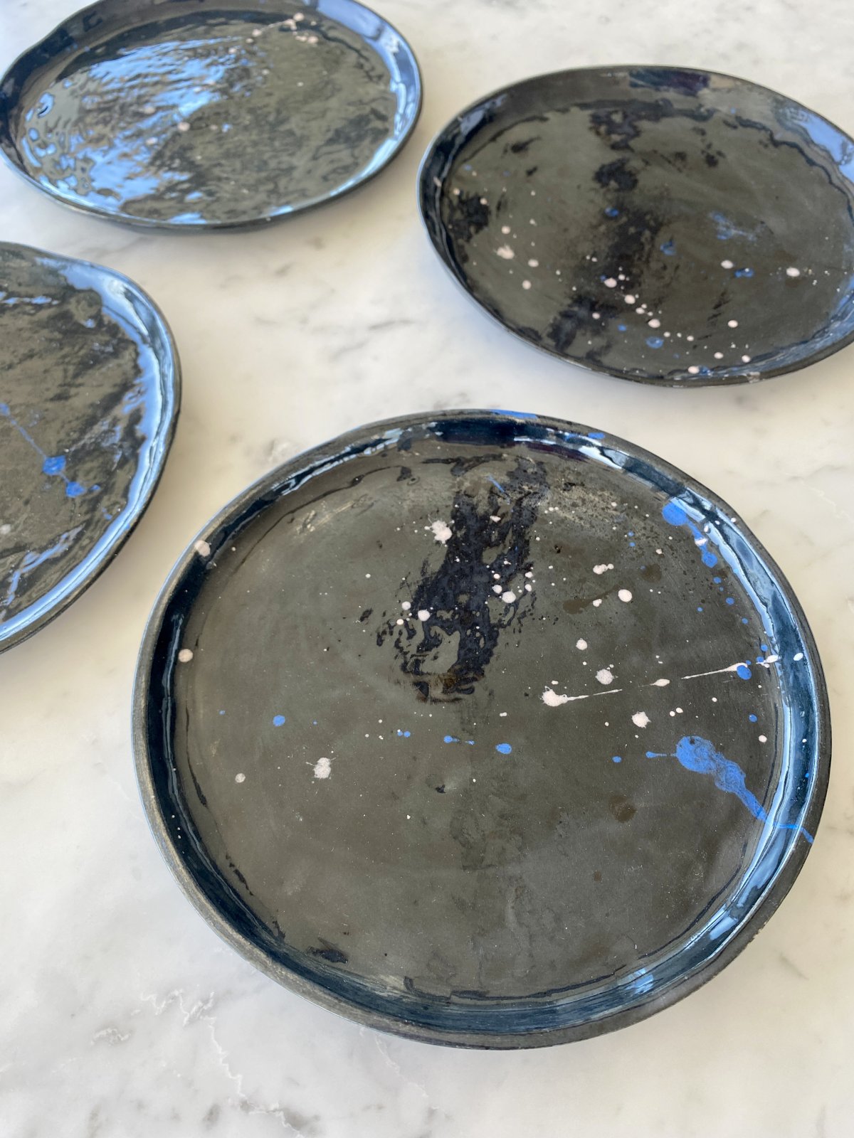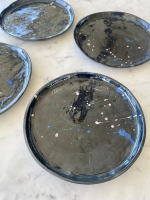 4 assiettes disponibles pour cette série bleue – chaque pièce est unique, avec des variations de couleur et de texture.  Prix pour un exemplaire.