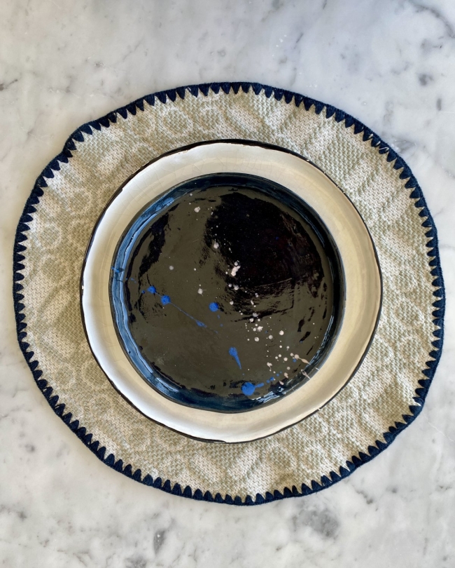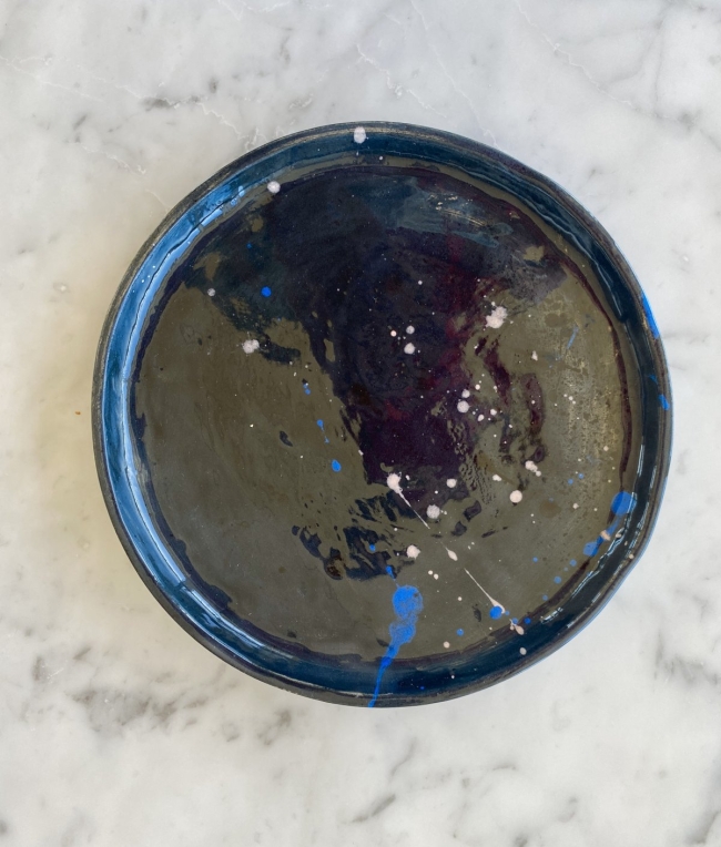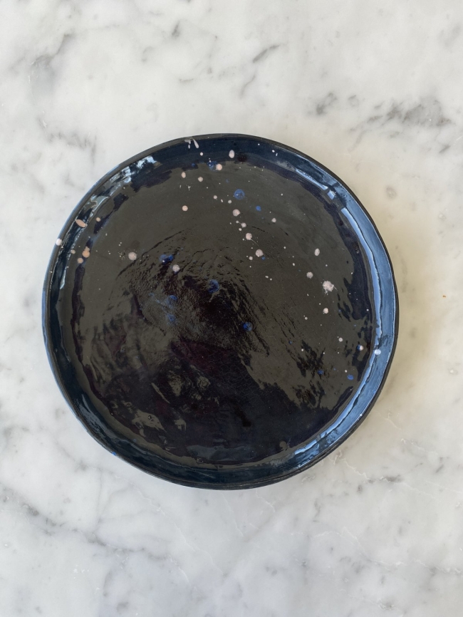 Cette pièce unique, aux nuances profondes de noir constellé de taches bleues évoquant l’immensité de l’Univers, apportera une touche singulière à votre table.