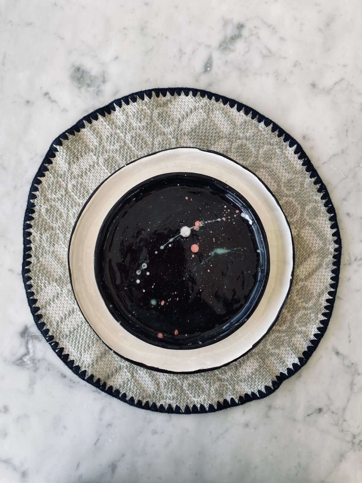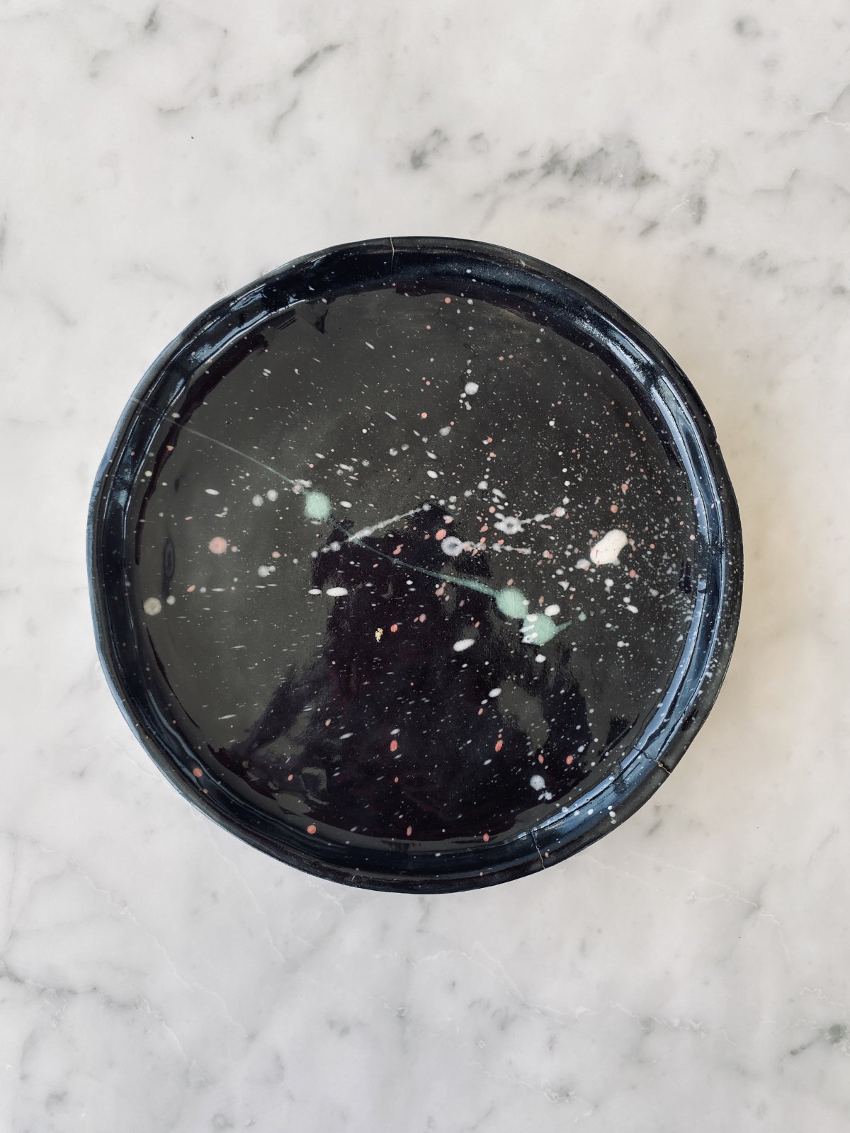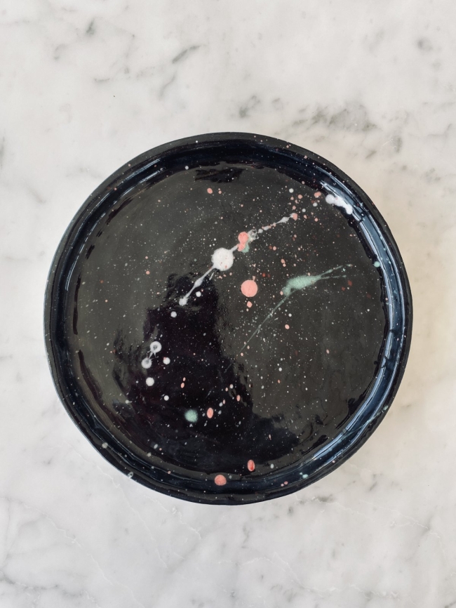 Cette pièce unique, aux nuances profondes de noir constellé de taches vertes et roses évoquant l’immensité de l’Univers, apportera une touche singulière à votre table.
