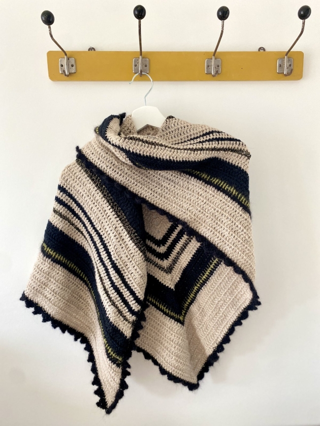 Le modèle porte une écharpe Thelma & Louise aux couleurs différentes de celle proposée ici.