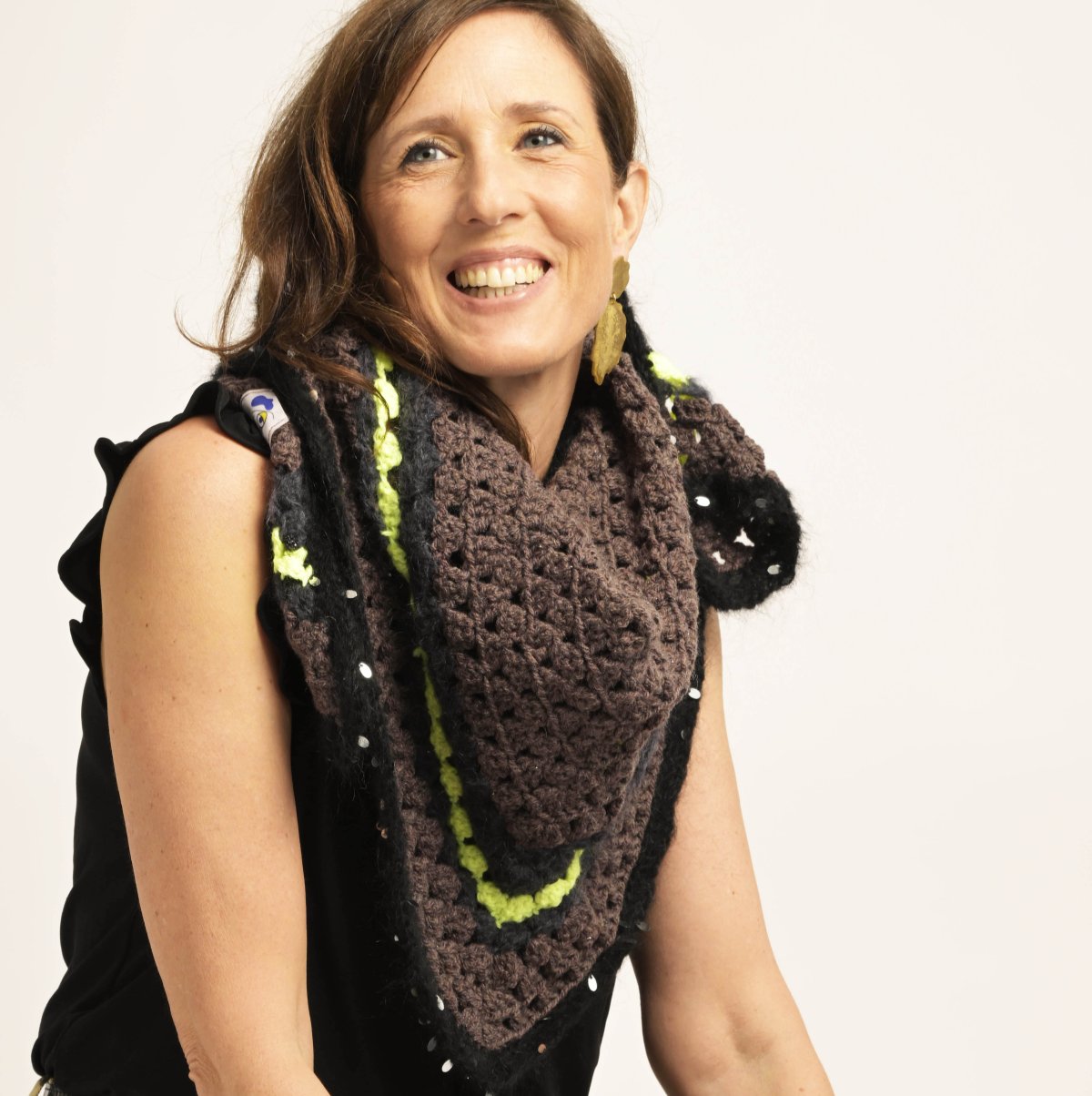 Le modèle porte une écharpe Thelma & Louise aux couleurs différentes de celle proposée ici.